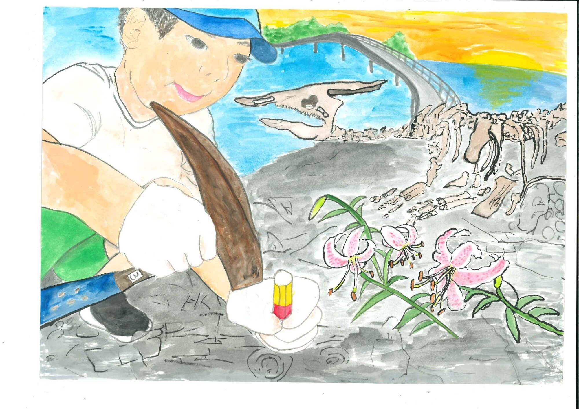 岩を掘るのをやさしく見まもる「かのこ百合」がかわいいですね。